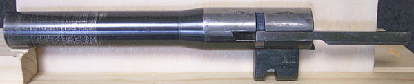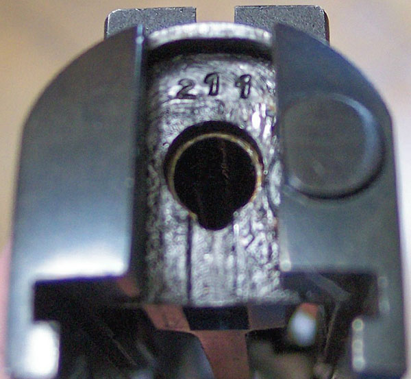 Close-up of underside of slide.  Notice how firing pin stop of the Ace model has a roller on the bottom.