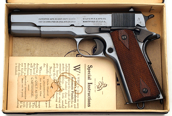 Colt Government Model Caliber .45 ACP Serial Number C88578 - Manufactured in 1917 in original box (numbered to the gun) with gray instructions, special instructions and factory hang tag.  Pistol is all original with blue finish, double diamond checkered walnut grips and original lanyard loop magazine.  Colt Target Pasters and part of original 1917 Colt catalog are also visible in this photo.