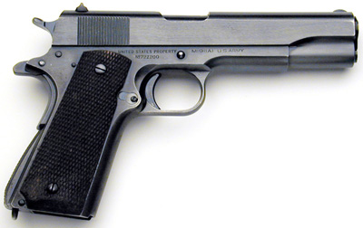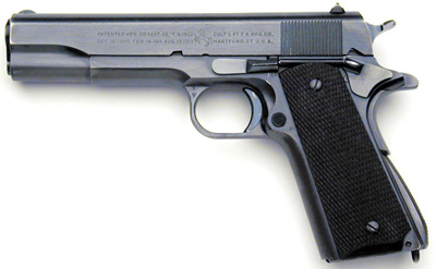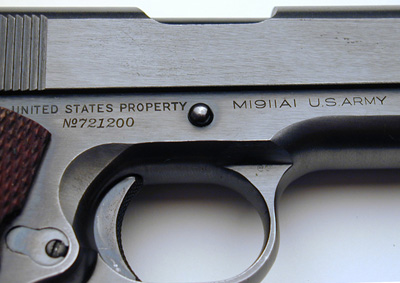Model 1911A1 Serial No. 721200 - A 1940 production pistol that was part of the second Army contract for that year. The second order ranged from sn 719753 to 721977 inclusive with deliveries beginning in October. From Colt, this pistol was delivered to the Commanding Officer, Springfield Armory on December 27, 1940. Serial Numbers 721190 to 721263 inclusive were then delivered December 23, 1941 to Naval Operations Base, Norfolk, Virginia. There is a P proof on the top of the slide, in front of the rear sight and alto a P on the left side of the frame near the magazine release button. The barrel in this gun is marked COLT .45 AUTO on the left side, with the G in front of the barrel lug on the underside of the chamber. There is a P on the left lug. ![]() Right Side close-up.