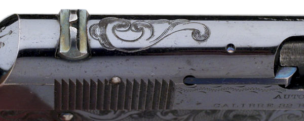 Factory "A" Engraved Colt Model M .32 ACP - serial number 90175.  Pistol was shipped blued, factory engraved with hard rubber grips.  An unusual example as it contains all early Type III features even though it's in the Type II serial number range (approx. 72,000 - 105,000).  Pistols in this range typically have a 3 3/4" barrel with separate barrel bushing.