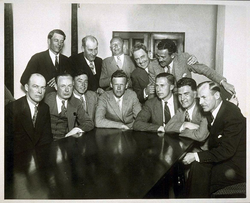 Carroll E.B. Peeke (fourth from right) of the San Francisco Call-Bulletin in photograph with other members of the press and Charles Lindbergh (fifth from left). This was taken during Charles Lindbergh's visit to Monterey, California. [California Heritage Collection, The Bancroft Library, University of California, Berkeley; BANC PIC 1985.054:8--AX]