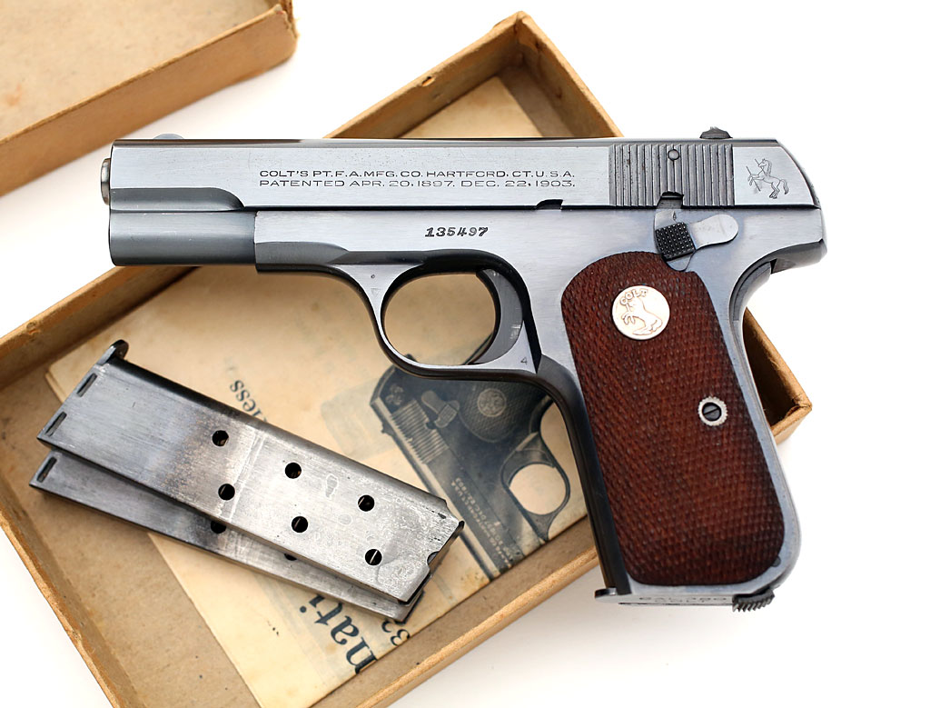 Colt Model 1908 Pocket Hammerless .380 ACP - Issued to Brigadier General Dabney Otey Elliott, with original box, instructions and spare magazine and his Model 1900 American Eagle Luger 7.65mm